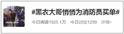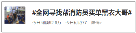 “黑衣大哥”的举动被媒体报道后,全网都开始寻找这位善良的好心人。话题#黑衣大哥悄悄为消防员买单#、#消防员的这则寻人启事好暖#、#全网寻找帮消防员买单黑衣大哥#相继登上热搜,并引发网友大量转发。
