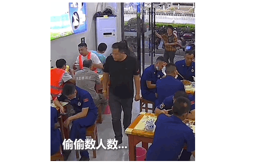 视频显示,黑衣男子在拉面店内用餐完毕准备离开时,看到了店内的消防员们,他偷偷地清点了人数,问老板:“一共多少钱?再把他们消防员的一起算上。”一并结账后,男子默默地离开了店里。