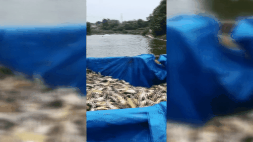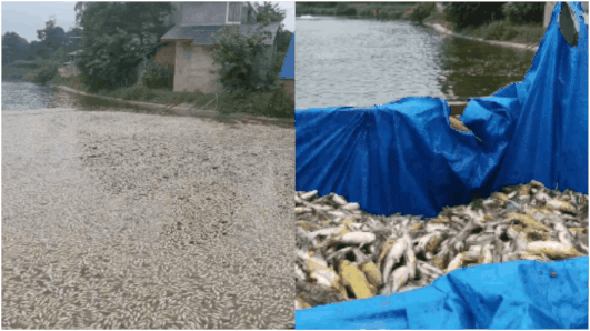 郝世云:死亡的黄辣丁有四五万斤,6月16号,几十个人在这整了一天,帮忙捞鱼。