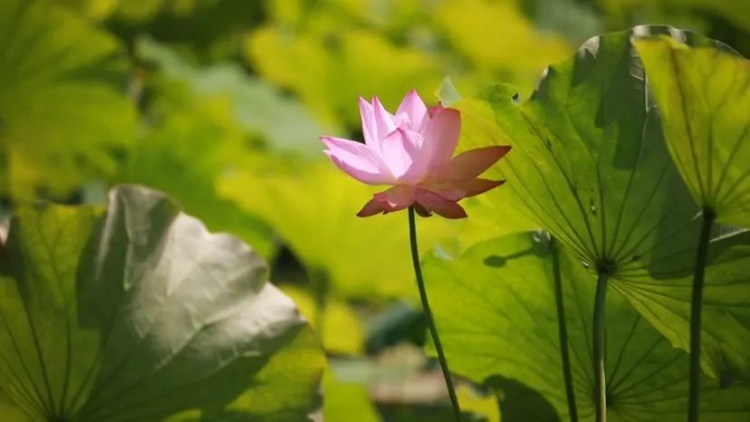 在世纪公园蒙特利尔园边,近4000平方米的荷花池里,大片的荷叶如一张张伞盖依偎相连,层层起伏,叠翠飘逸。几朵新荷抢先绽放,点缀其间,粉红的花瓣肆意舒展,亭亭玉立。池畔、栈道上,风荷桥边,处处可见蜂蝶飞舞,花人相融。