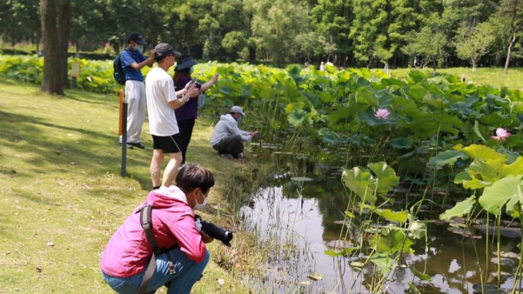 悠悠夏日,世纪公园里莲花、荷花陆续开放,翠绿的荷叶铺满整个池塘,构成一幅迷人的清新画卷。美丽的景色也吸引了不少市民前来赏花、纳凉、拍照。