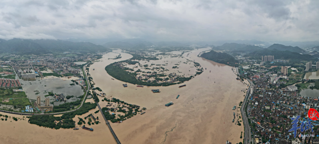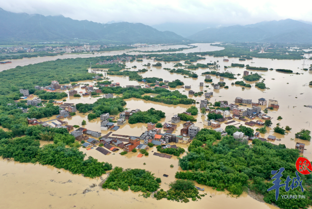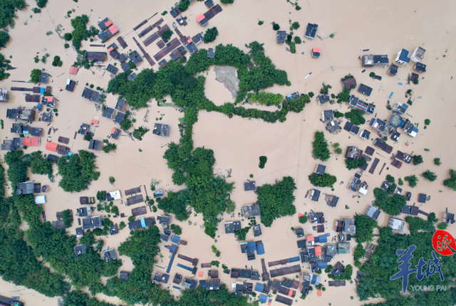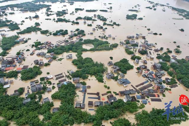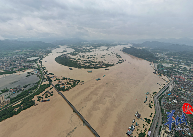 记者通过航拍画面看到,在防洪堤外,江南村、沙角村被江水围住。