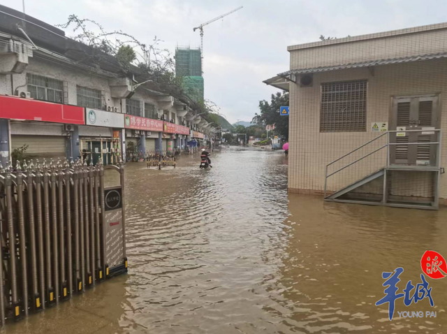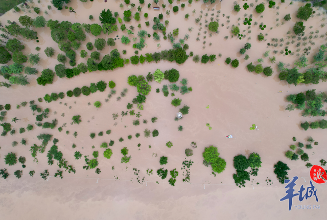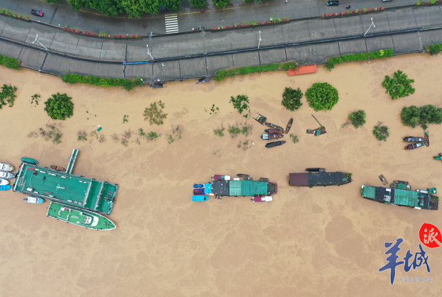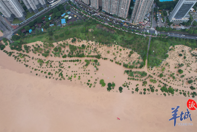 在长堤路不远处,就是防洪堤。受连日强降水影响,北江水面暴涨。羊城晚报全媒体记者在防洪堤上看到,堤坝对面的滨江步道已被浑黄的江水淹没,江面已升至路旁商铺门楣处,道旁的树木、路灯也只有少许一截露在水面之外。