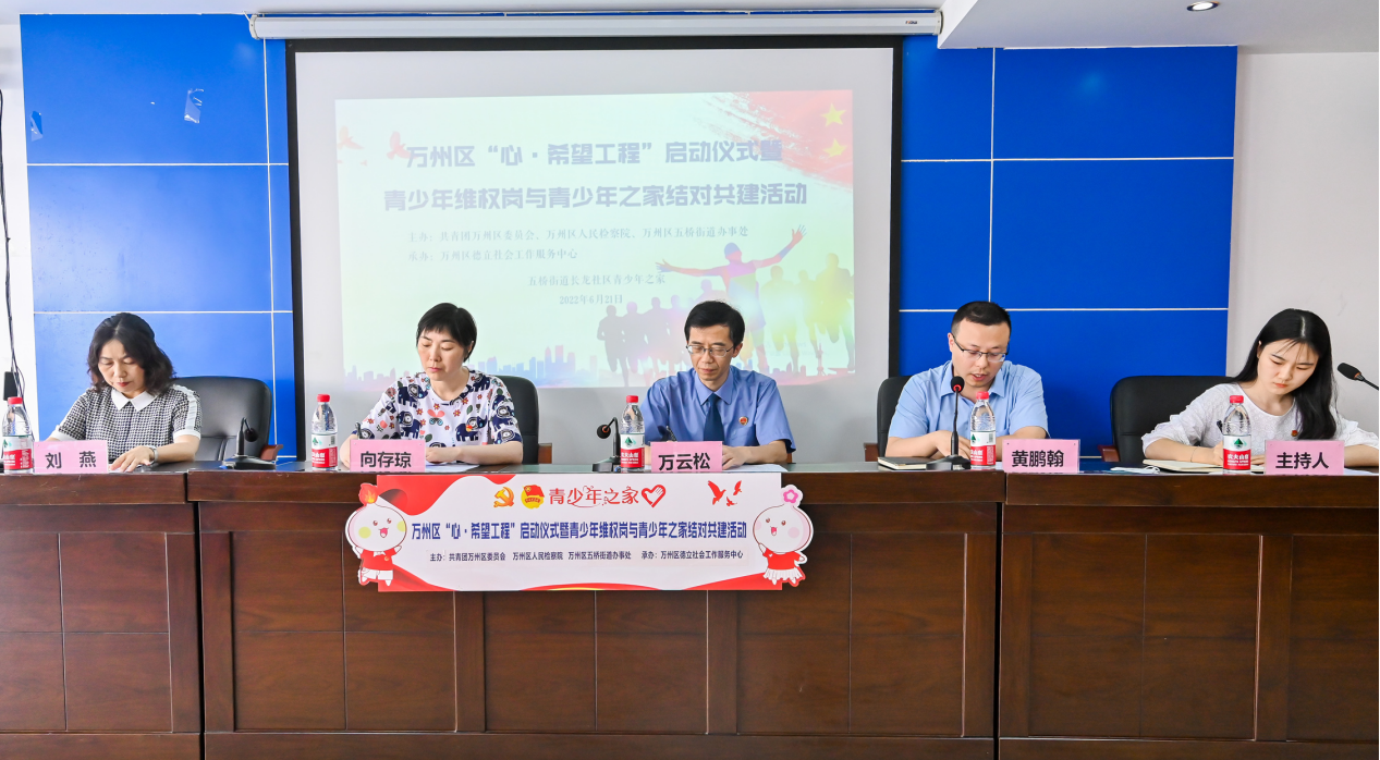 2022年6月21日上午,由共青团重庆市万州区委员会、万州区检察院、五桥街道办事处主办,德立社会工作服务中心实施的万州区“心·希望工程”启动仪式暨青少年维权岗与青少年之家结对共建活动在五桥街道长龙社区顺利开展。