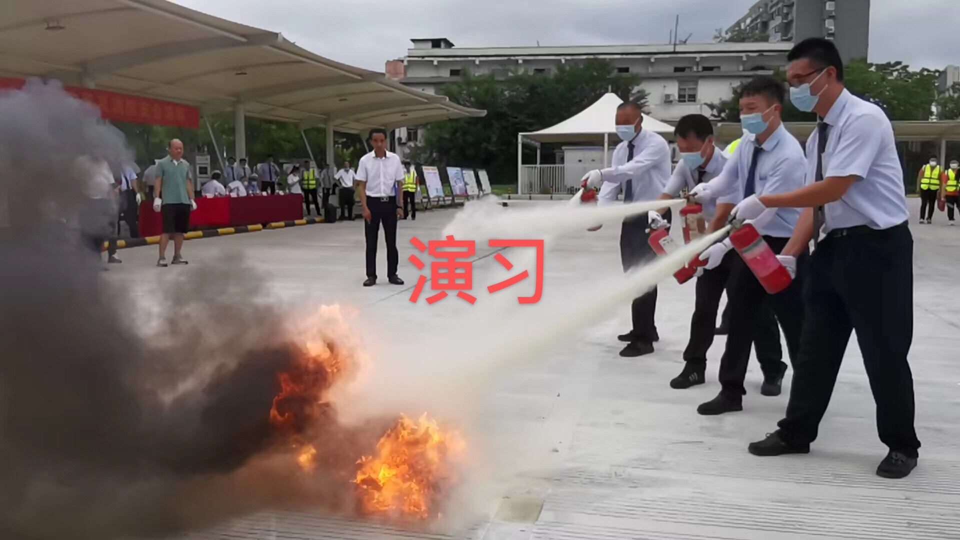 当天,员工们还进行了火险现场处置的实操演练。模拟保修车间里,一名员工不慎引燃了两个大油盆,顿时火光四溅,烈火熊熊。15名员工立即行动,拿起一旁的灭火器,分三组前来灭火,只见大家操作熟练,拿起8公斤的灭火器后,先是摇晃瓶器、拉掉保险、拔出插销,再手握喷管快步跑到距离火盆2米处,对准火焰根部后按压手柄,全力喷射,确保干粉覆盖整个燃烧区域。很快,大火被成功扑灭。整个演练过程组织有序,操作规范、动作娴熟,员工的安全防范能力及应对突发事件的能力得到提升。
