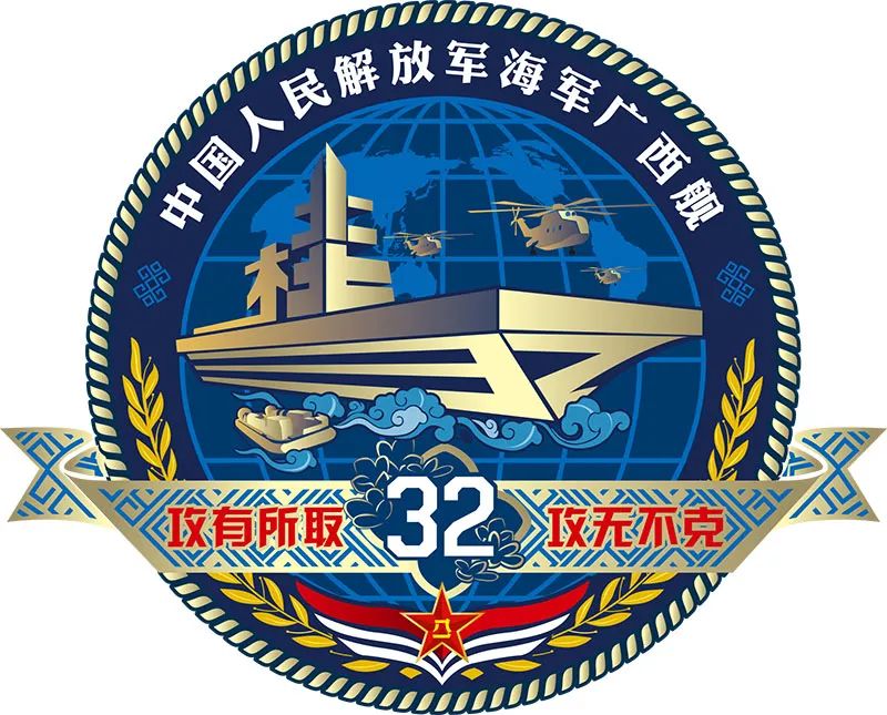 广西简称“桂”,该舰徽以“桂”字为主体造型,“攻有所取 32 攻无不克 ”飘带造型融入了广西壮族元素,衬托舷号“32”的花朵是广西具有代表性的桂花。