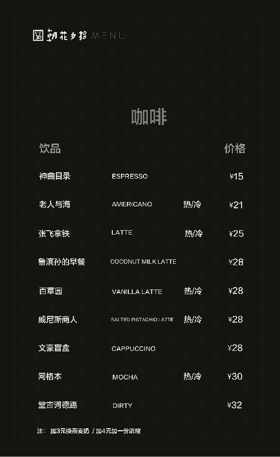 作为朝花夕拾最让读者摸不清头脑的饮品之一,张飞拿铁在开业之初就收到了读者们一连串的问号,但仔细想想,莫名其妙之中又透露着那么一丝合理?!毕竟张飞手里拿的,那不就是铁么!而隔壁中信建投的朋友们则为这款谐音为“涨飞”的饮品贡献了至少百分之七十的销量,不得不说,喝个咖啡都要讨个好彩头,中信建投的衬衫小哥,真有你的!