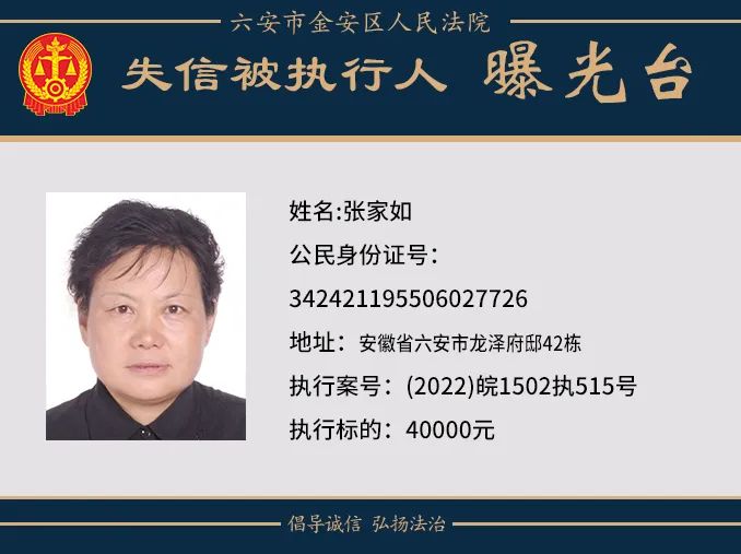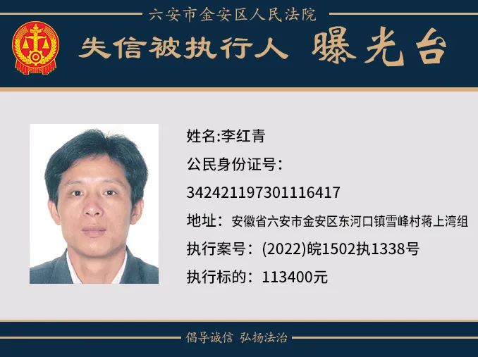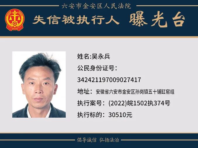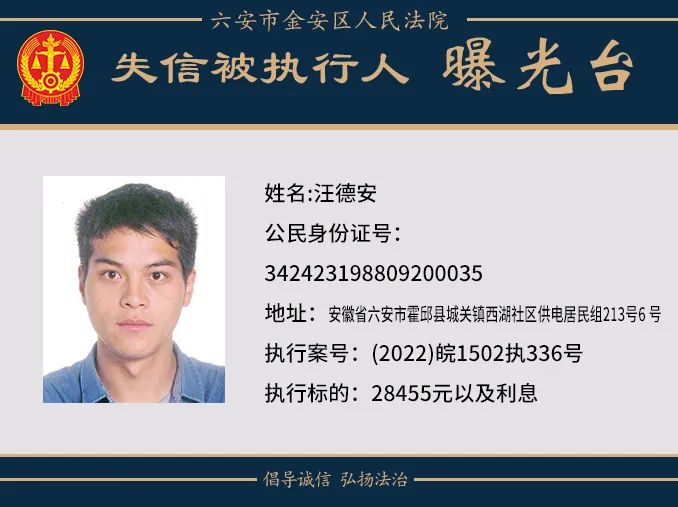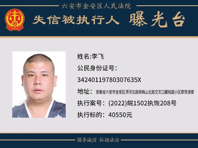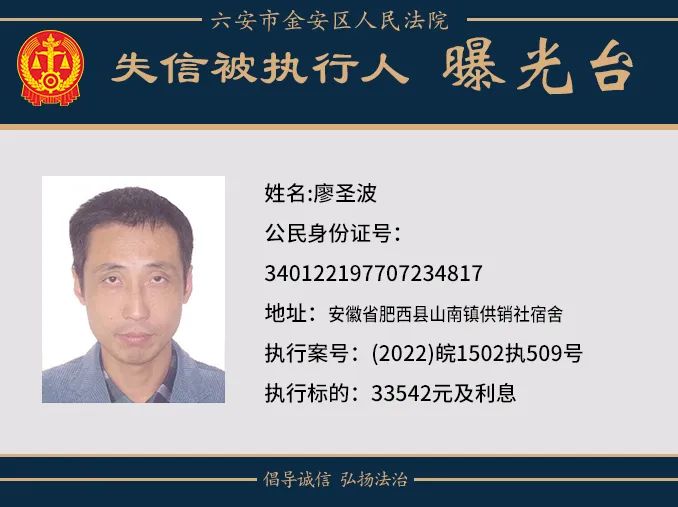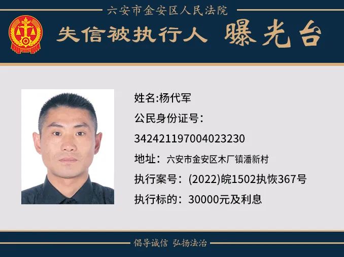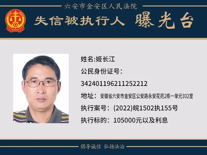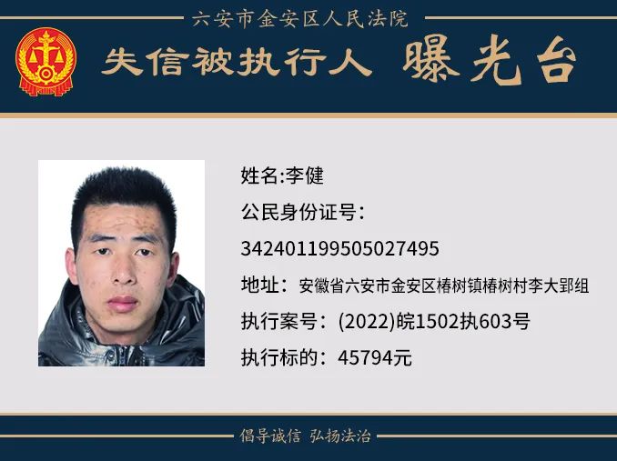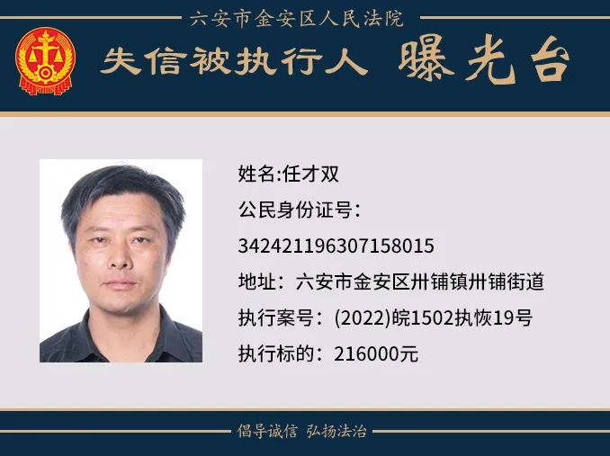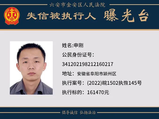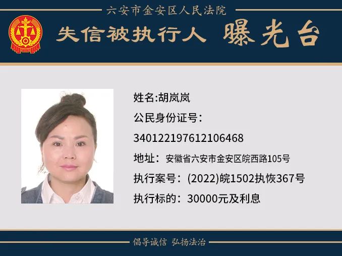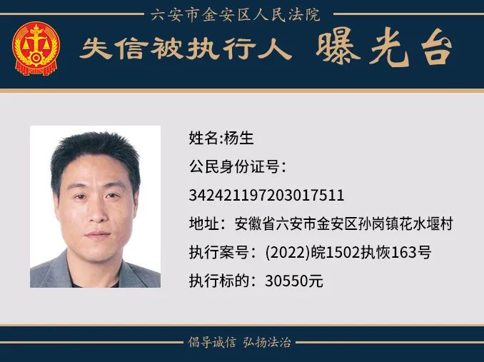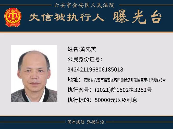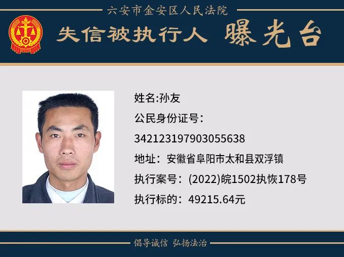 为进一步促使被执行人自觉履行生效法律文书确定的义务,维护当事人的胜诉权益,推进社会信用体系建设,金安区人民法院根据《中华人民共和国民事诉讼法》及相关法律规定,决定对下列47名失信被执行人予以曝光。同时,欢迎大家积极提供失信被执行人财产线索。