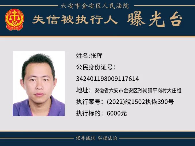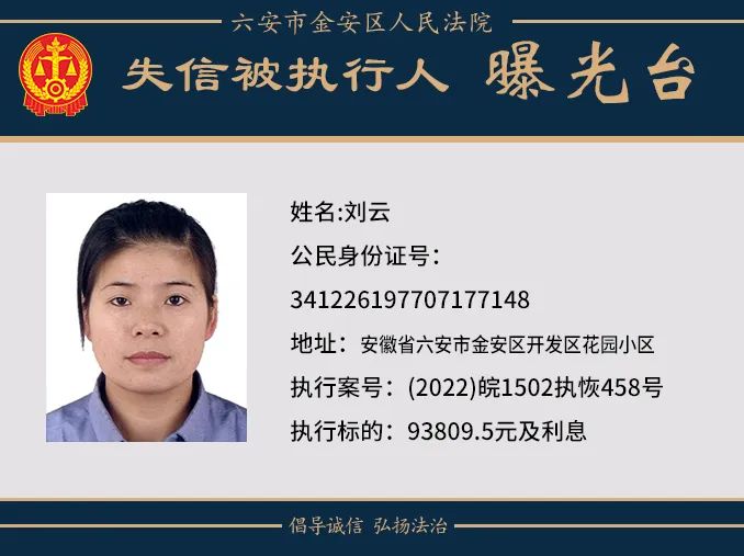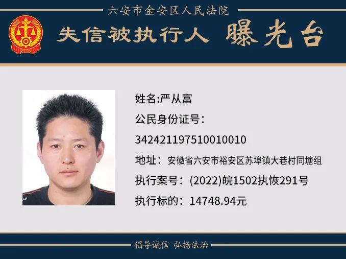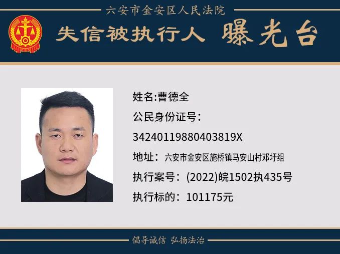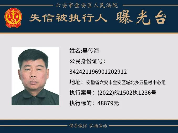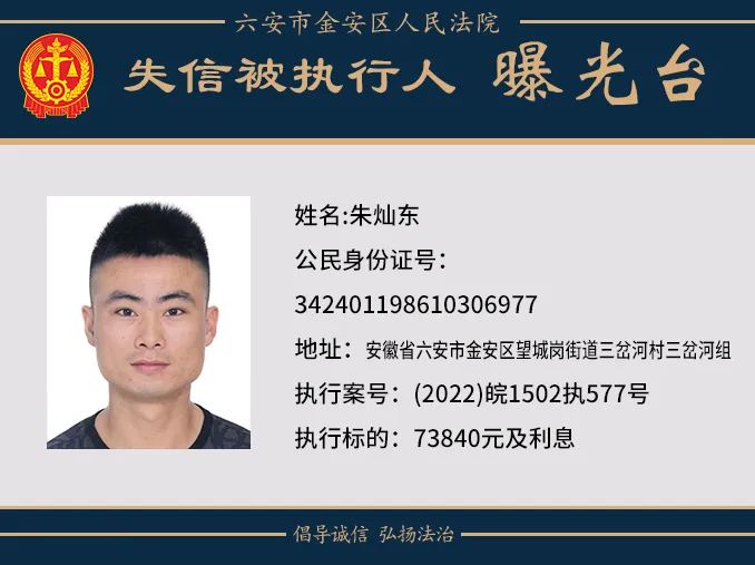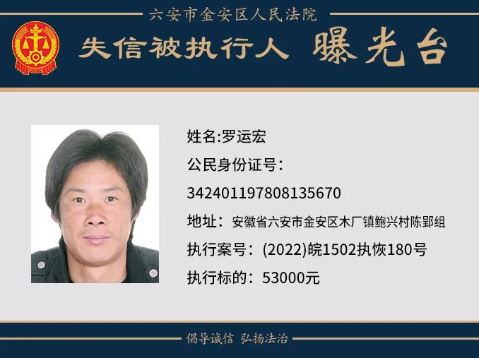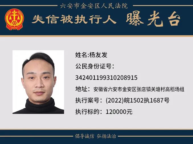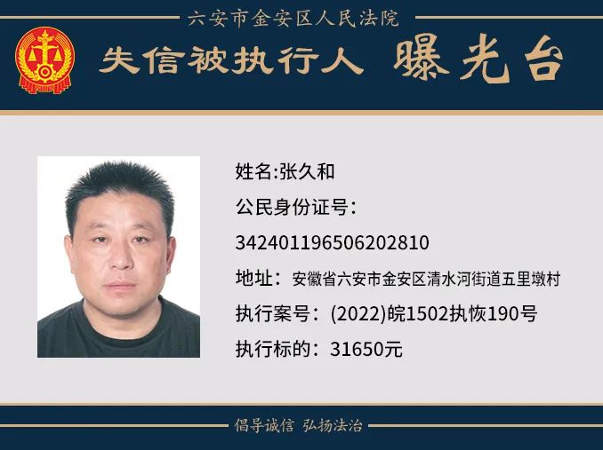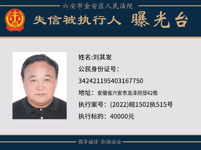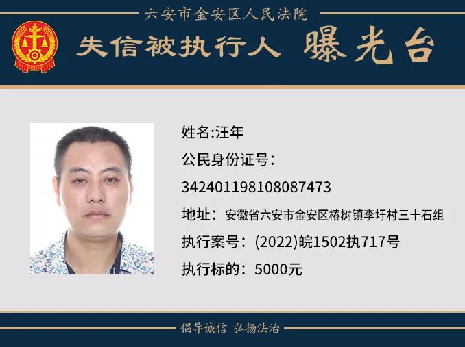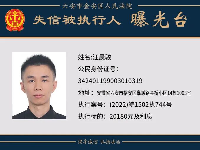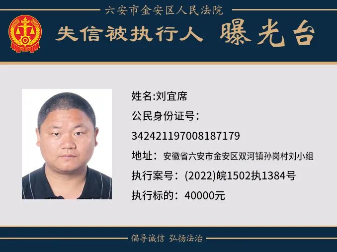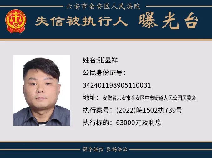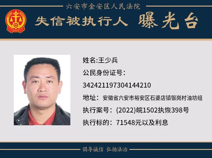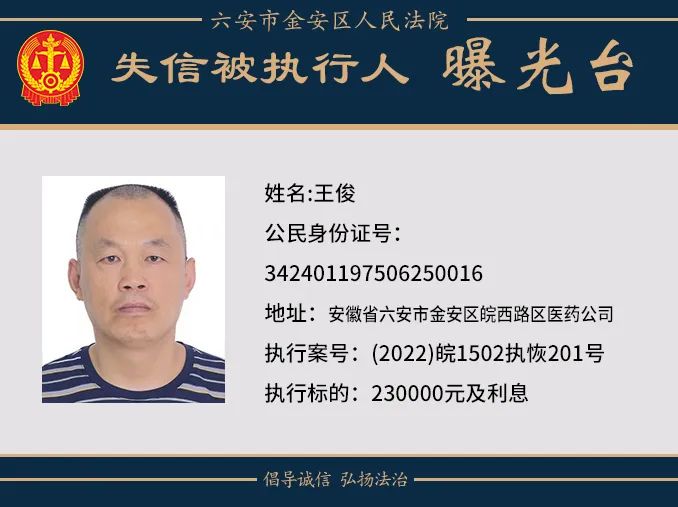 为进一步促使被执行人自觉履行生效法律文书确定的义务,维护当事人的胜诉权益,推进社会信用体系建设,金安区人民法院根据《中华人民共和国民事诉讼法》及相关法律规定,决定对下列47名失信被执行人予以曝光。同时,欢迎大家积极提供失信被执行人财产线索。