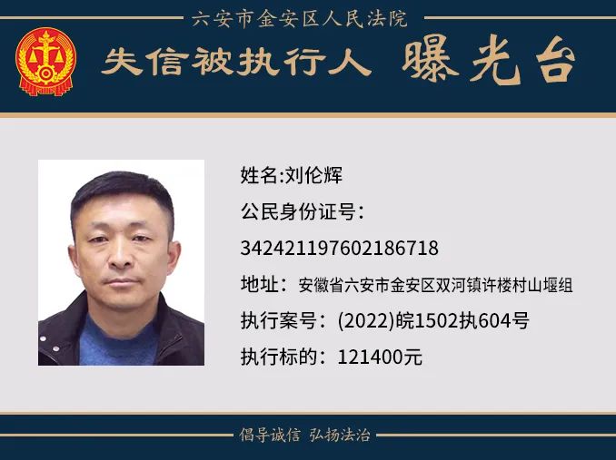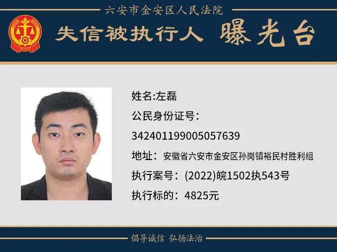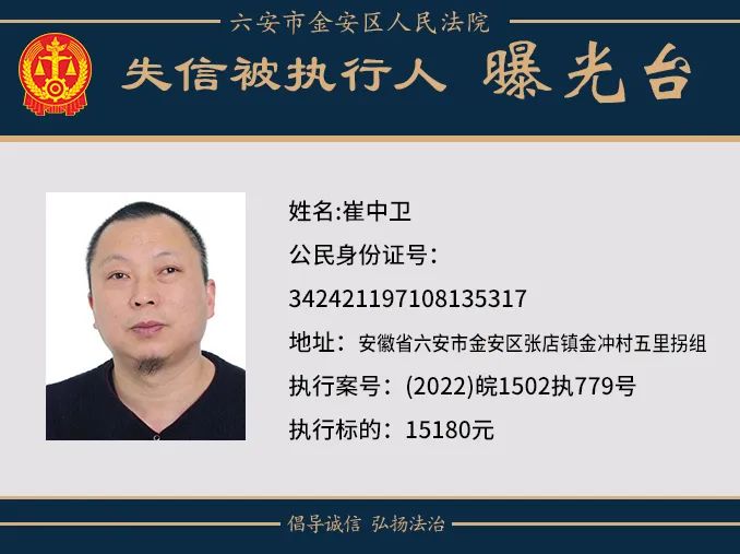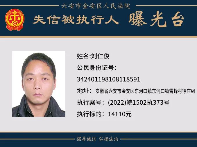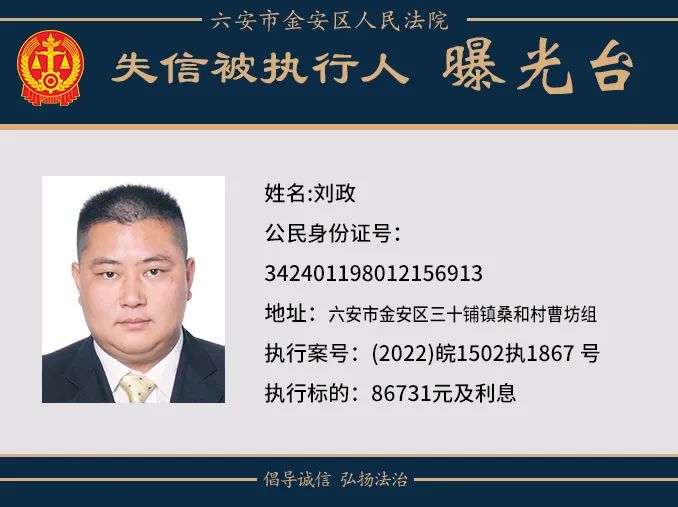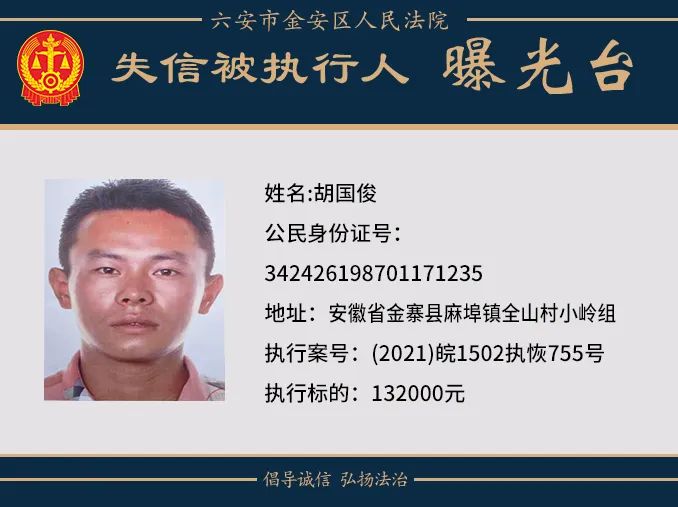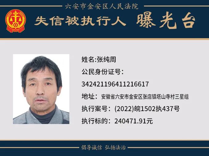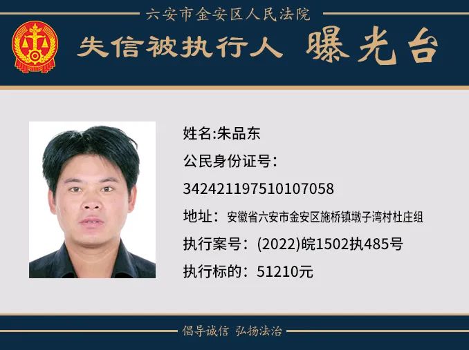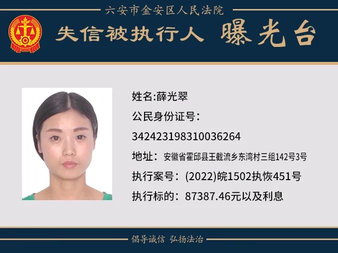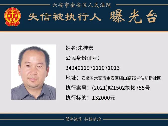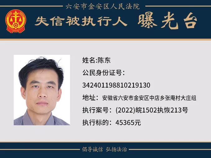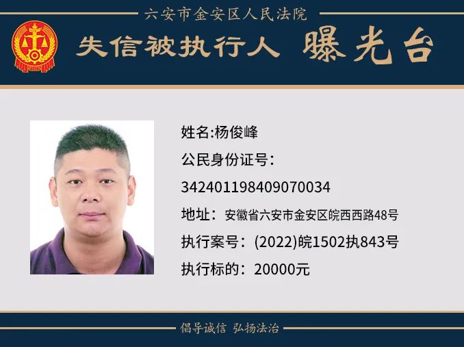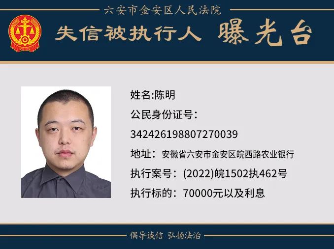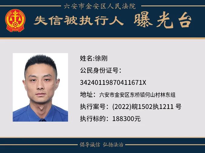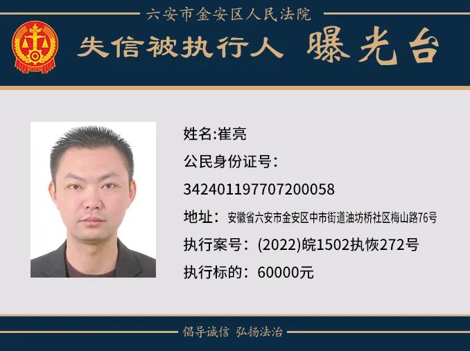 为进一步促使被执行人自觉履行生效法律文书确定的义务,维护当事人的胜诉权益,推进社会信用体系建设,金安区人民法院根据《中华人民共和国民事诉讼法》及相关法律规定,决定对下列47名失信被执行人予以曝光。同时,欢迎大家积极提供失信被执行人财产线索。