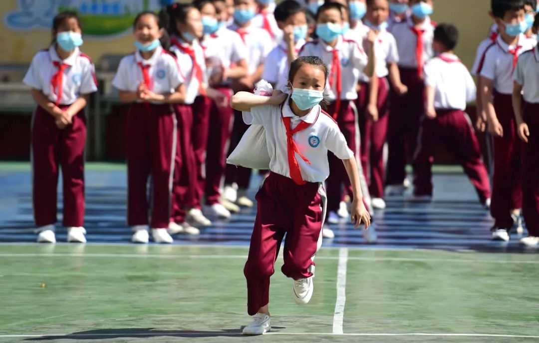 河北省沧州市车站小学的学生在进行运麦比赛。傅新春 摄