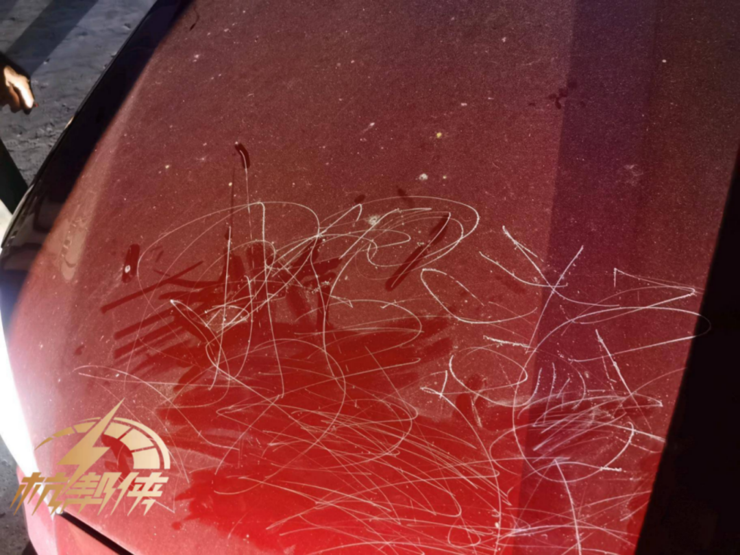 从照片中可以看出,车子前引擎盖上的红色车漆被一道道毫无规律的白色划痕占据,看起来车损不小。