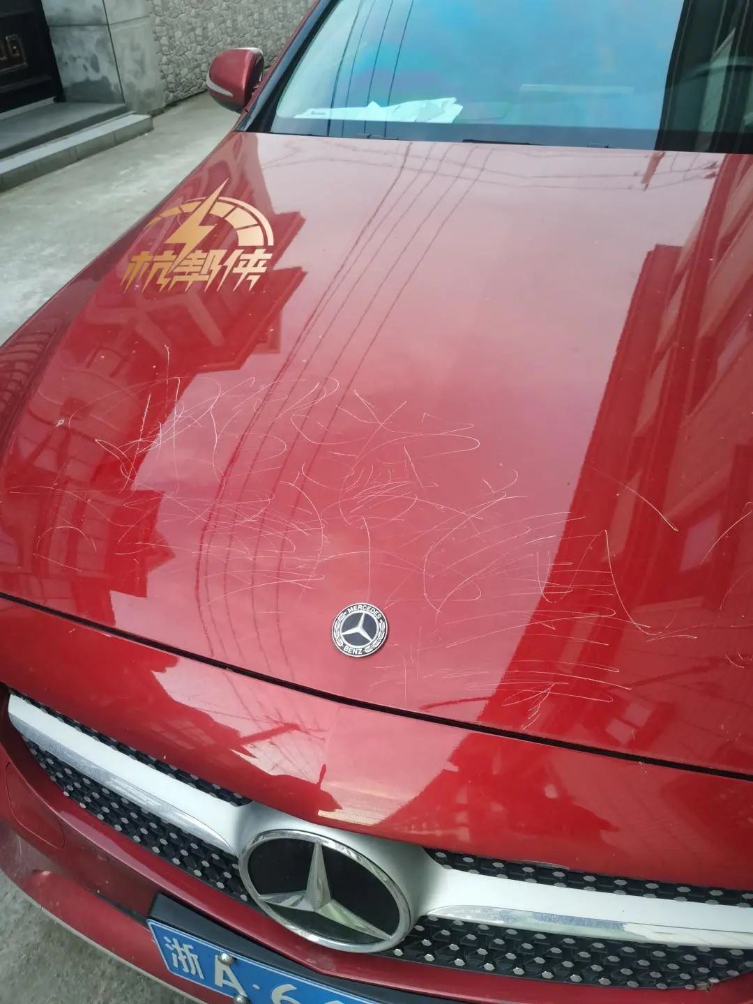 “我家在杭州市萧山区义桥镇北坞村新农村,平时我习惯把车停在自家后门停车库卷闸门外的村道上,这样停车已经2年了。6月22日16:00左右,我把我的红色奔驰车停在了这里,仅仅过了三小时,到下午19:00左右,我再次下楼看的时候,发现我的车前引擎盖被划出了大花脸!”孙女士气愤地说。