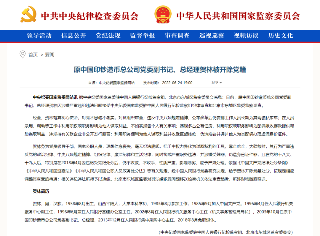 据中央纪委国家监委驻中国人民银行纪检监察组、北京市东城区监察委员会消息:日前,原中国印钞造币总公司党委副书记、总经理贺林因涉嫌严重违纪违法问题接受中央纪委国家监委驻中国人民银行纪检监察组纪律审查和北京市东城区监委监察调查。