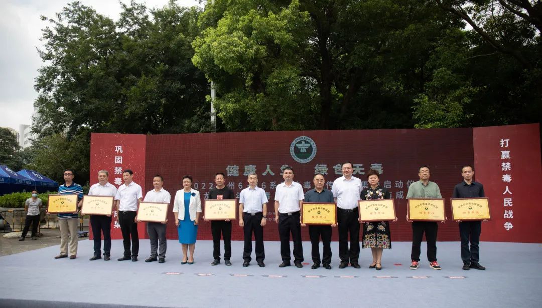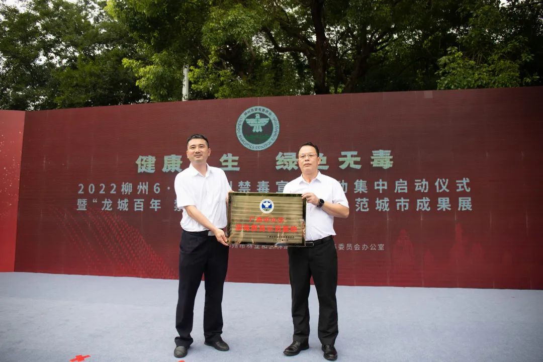 启动仪式上,对广西中小学禁毒教育示范基地、“柳州市禁毒高校联盟”成员单位授牌,向柳州禁毒形象大使颁发证书。