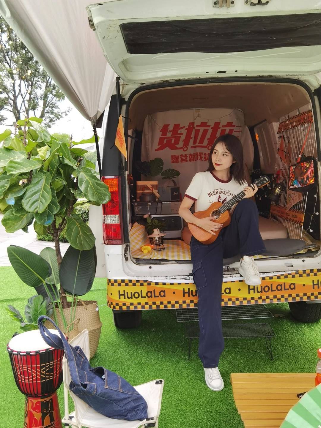 露营车旁边的厢式中货车同样吸引了众多年轻人的目光,露营主题的艺术打卡装置,将平面视觉和立体感官在四米二长的车厢内相结合,清新露营氛围与货车的钢铁硬核气质互相印衬,营造“货拉拉露营躺平区域打卡点”,路过的青年男女纷纷驻足拍照并进入车厢打卡,成为现场一道靓丽风景线。