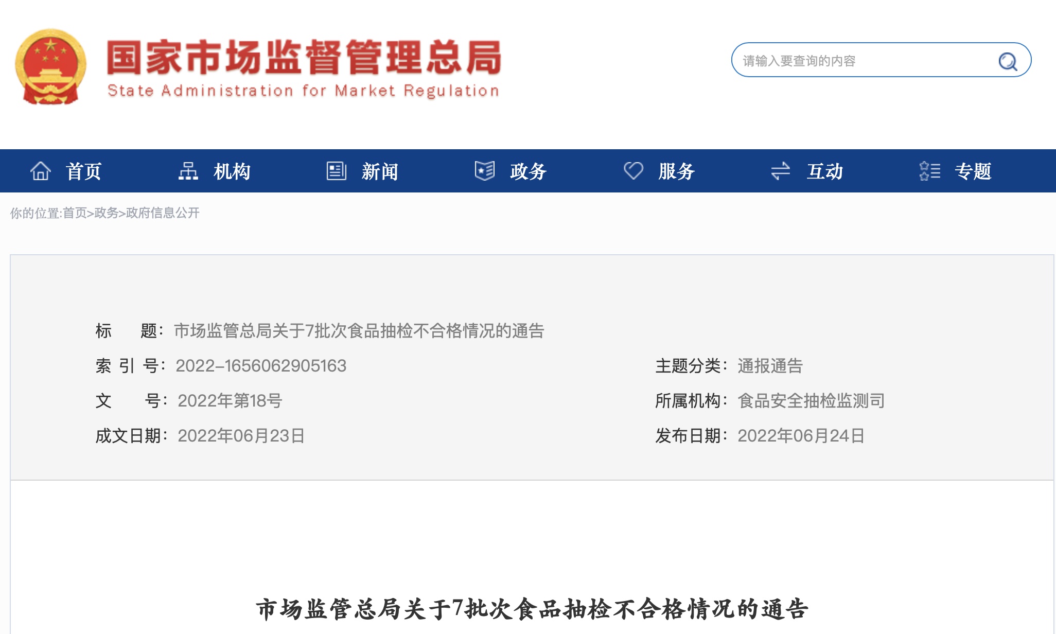 近期,市场监管总局组织食品安全监督抽检,抽取粮食加工品、食用农产品、食糖、茶叶及相关制品、乳制品、饮料、酒类、糕点、炒货食品及坚果制品、饼干、淀粉及淀粉制品、方便食品、薯类和膨化食品、蛋制品、豆制品、蜂产品、罐头、蔬菜制品、水果制品、肉制品、水产制品、调味品、冷冻饮品、速冻食品、婴幼儿配方食品、保健食品、特殊膳食食品和食用油、油脂及其制品等28大类食品505批次样品,检出其中炒货食品及坚果制品、蜂产品、水果制品、水产制品、冷冻饮品等5大类食品7批次样品不合格。发现的主要问题包括微生物污染、食品添加剂超限量使用等。产品抽检结果可查询https://spcjsac.gsxt.gov.cn/。