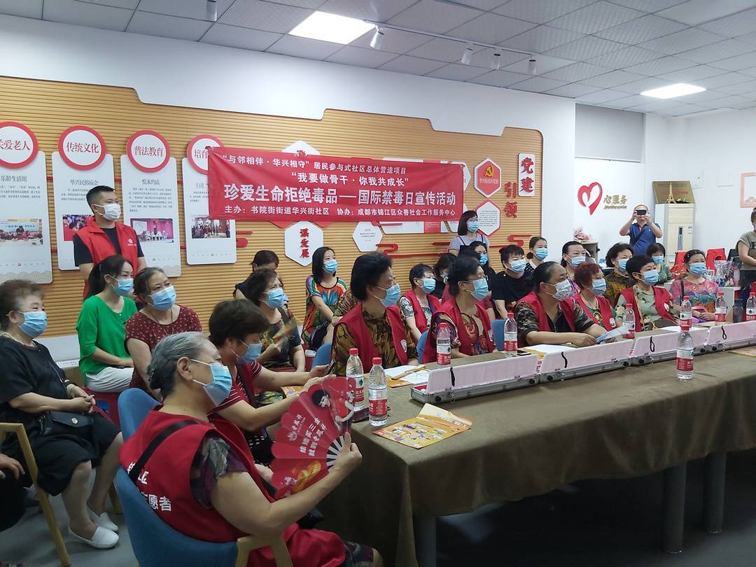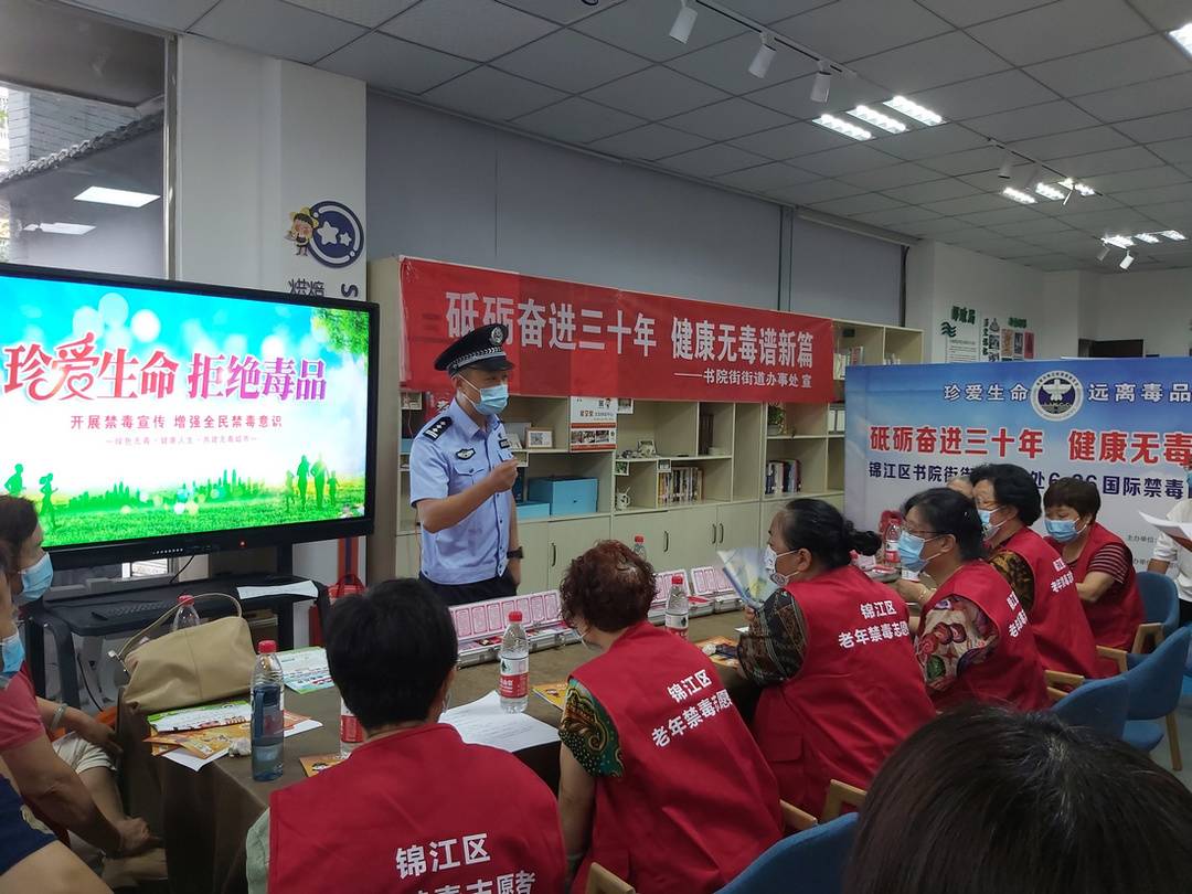 6月26日是国际禁毒日,成都锦江区书院街街道华兴街社区联合街道综治办、派出所,在社区小广场开展“关爱老人,远离毒品”禁毒宣传活动。