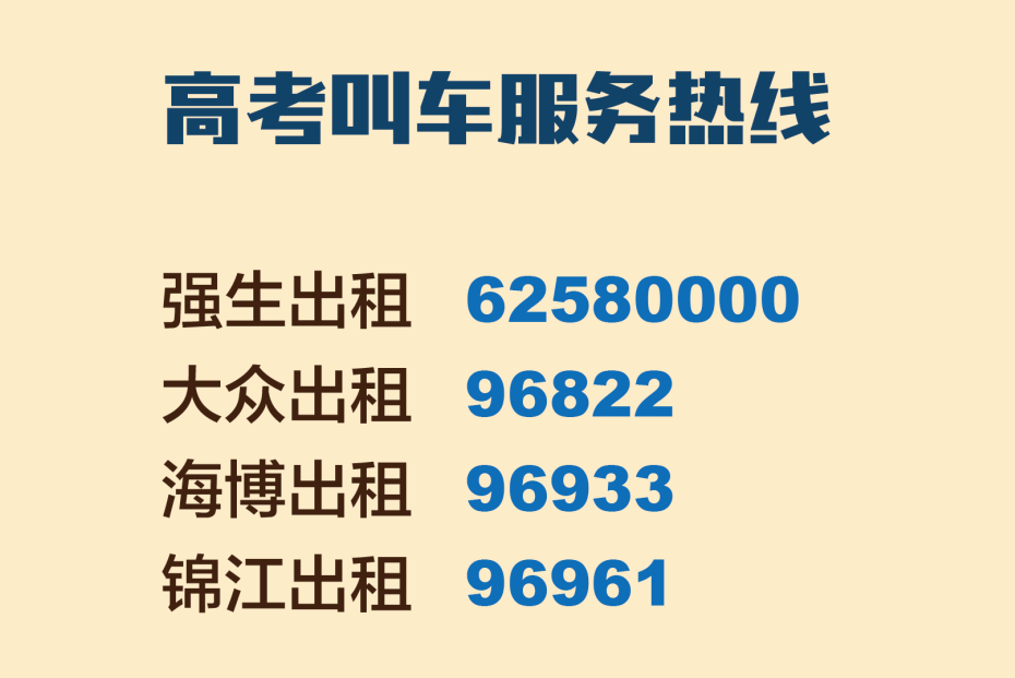 市民可拨打强生(62580000)、大众(96822)、海博(96933)、锦江(96961)的叫车电话进行预约。请各位考生和家长尽早预订,订完为止。
