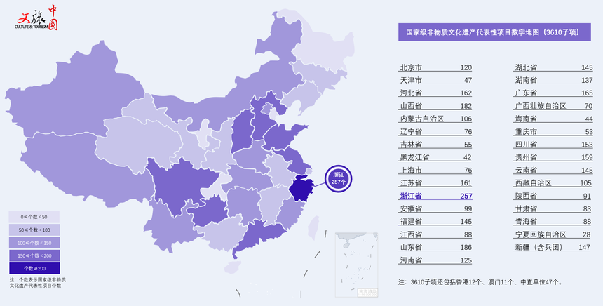 国务院先后于2006年、2008年、2011年、2014年和2021公布了五批国家级非遗代表性项目名录,共计1557个国家级非物质文化遗产代表性项目,共计3610个子项;从国家级非遗代表性项目数字地图来看,前三分别是浙江省257个子项,山东省186个子项,山西省182个子项。