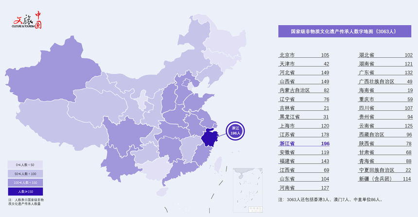 国家文化主管部门先后于2007年、2008年、2009年、2012年、2018年命名了五批国家级非物质文化遗产代表性项目代表性传承人,截至2021年12月,国家级非物质文化遗产代表性项目代表性传承人总计3063人;从国家级非遗传承人数字地图来看,前三分别是浙江省196位国家级传承人,江苏省178人,山西省149人。