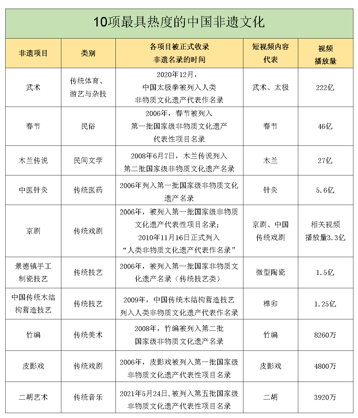 《2022中国非遗海外短视频影响力报告》以国家级项目名录所界定的非物质文化遗产为研究范围,选出了TikTok里10项最具热度的中国非遗文化项目: