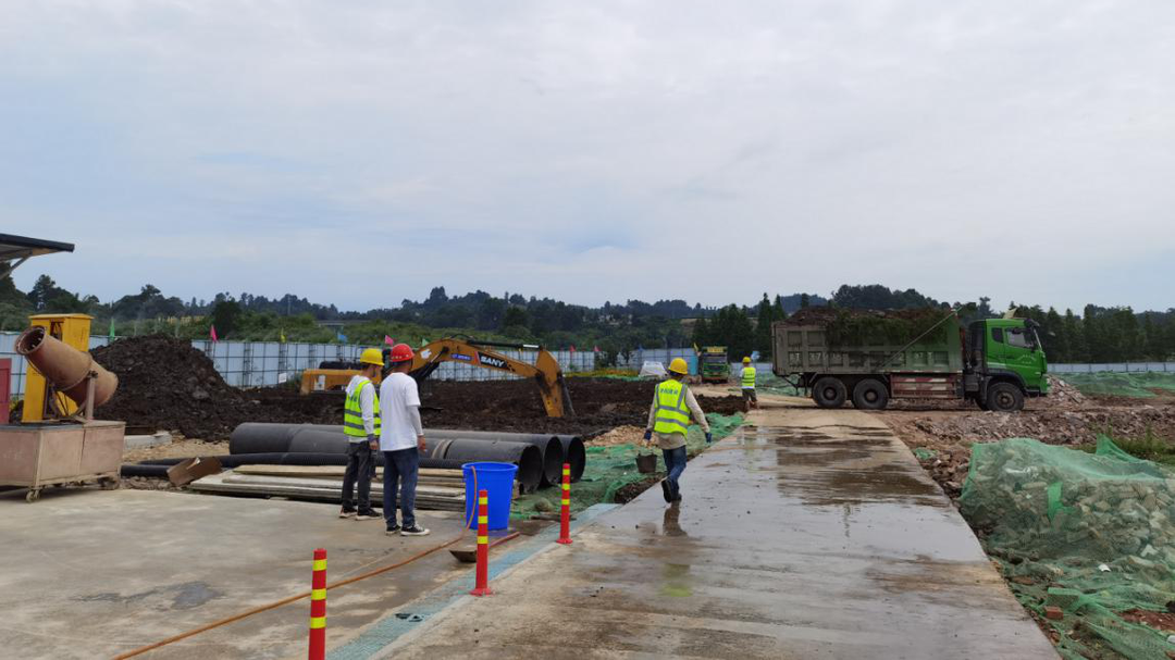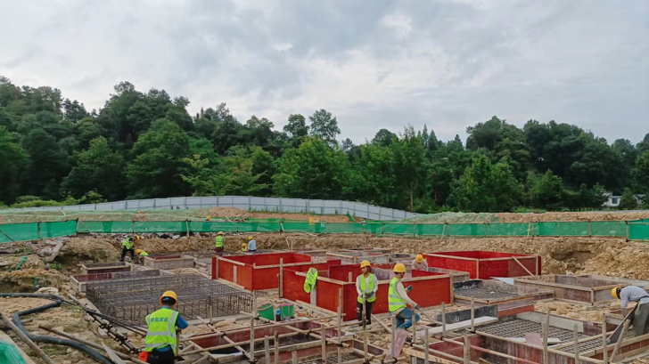 在项目入口处的建筑工地上可以看到,大型挖掘机挥舞着长臂,正在奋力开挖土方。另一边工地上,地基部分施工已经完成,部分工人正在捆扎钢筋。