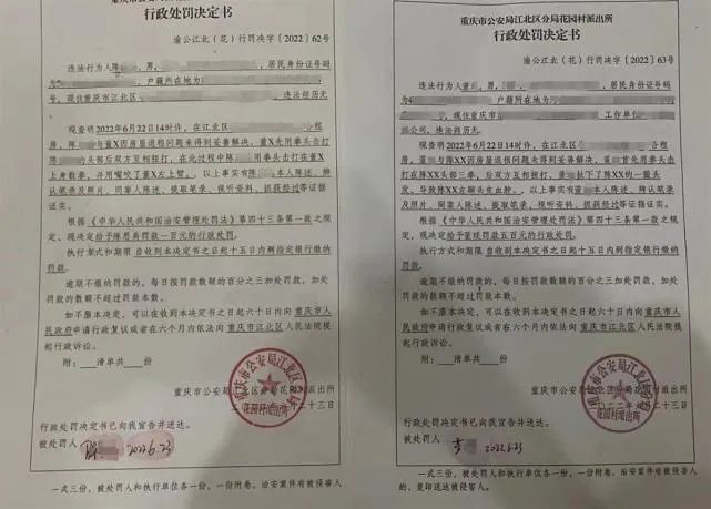 事后,陈先生报警处理此事。记者从警方出具的两份行政处罚决定书中了解到,陈先生与戴眼镜的男子董某因房屋退租问题未得到妥善解决。6月23日,警方根据治安管理处罚法相关规定,对陈先生和董某分别给予罚款100元和500元的行政处罚。