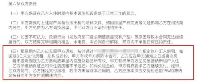此外,合同中约定,租赁期内租客应无需甲方通知,按时向指定账户汇入房租,如逾期3日未支付房租,则构成违约,甲方有权单方解除本合同,租客应在甲方通知之日搬离此房,若未搬离则视为租客自动放弃屋内设施及物品所有权,甲方有权单方收回房屋接纳新租户入住,租客所缴纳保证金和未住满房租不予退还。
