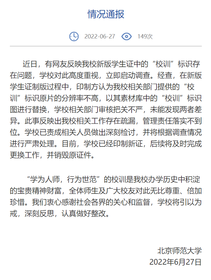 27日,北京师范大学发布《情况通报》称:在新版学生证制版过程中,印制方认为我校相关部门提供的“校训”标识原片的分辨率不高,以其素材库中的“校训”标识图进行替换;学校已经印制新证,后续将及时完成更换工作,并销毁原证件。