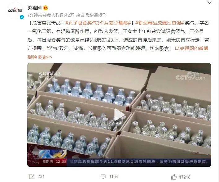 王女士半年前曾尝试吸食笑气,三个月后,每日吸食笑气的数量已经达到50瓶以上,造成的直接后果是,她无法直立行走。