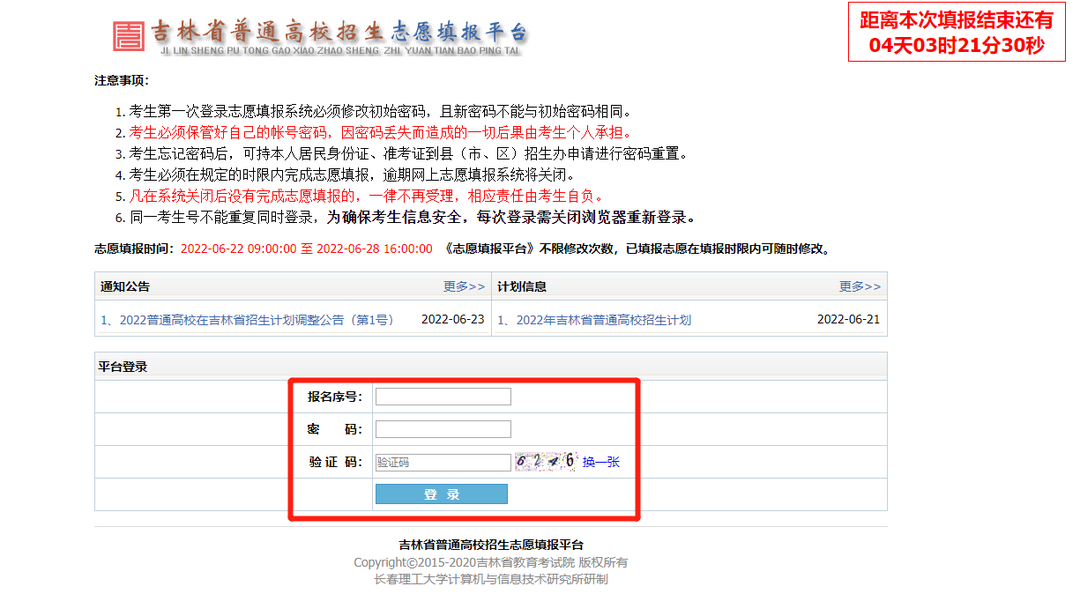 考生可凭本人高考报名序号和自行设置的密码登录"吉林省普通高等学校招生填报志愿平台",在规定时间内完成网上志愿填报。