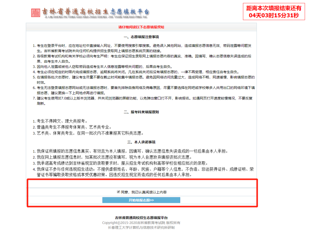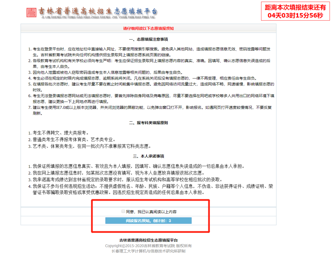 倒计时结束后,勾选同意,我已认真阅读以上内容,并且点击开始填报志愿。