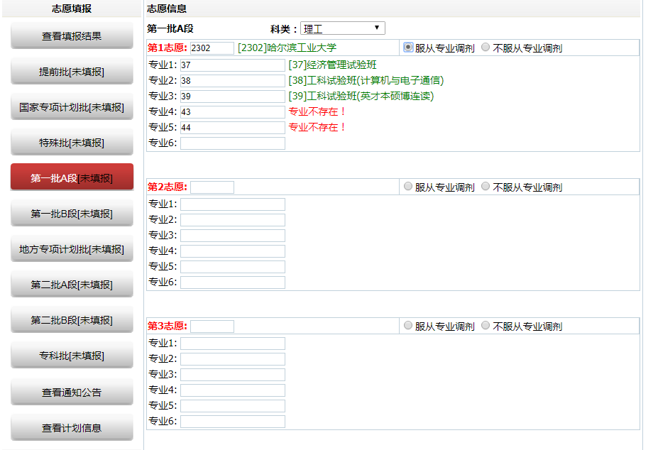 如果填报的院校代码、专业代码不对会出现红色字体提醒,如果正确显示绿色院校名字和专业。