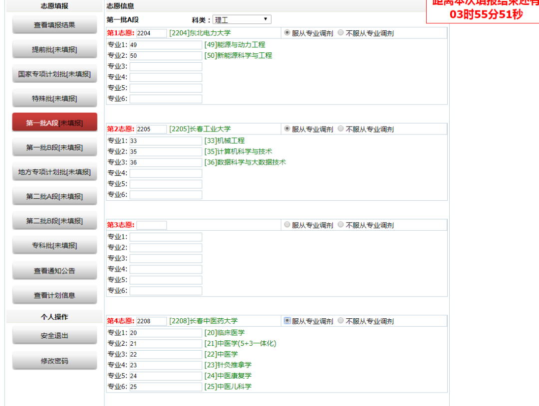 所有需要填报的批次均填报完毕后回到查询填报结果界面,再次检查所填报的批次、院校志愿、专业志愿、是否服从调剂等信息为正确信息,如需修改志愿,请点击你要修改的批次,最下方有修改,记得修改后要保存哦。