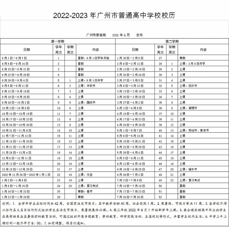●第一学期20周,2022年9月1日开学;高三年级2022年8月1开始新学年上课。寒假从2023年1月16日开始。