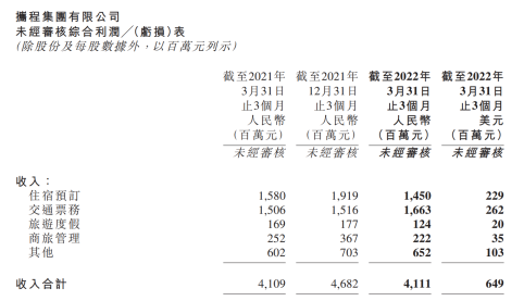 6月28日,携程集团(纳斯达克:TCOM及香港联交所:9961)公布了截至2022年3月31日第一季度未经审计的财务业绩。其中,2022年第一季度公司营业收入41亿元,其中,住宿预订收入15亿元,交通票务收入17亿元,旅游度假业务收入1.24亿元,商旅管理业务收入2.22亿元。
