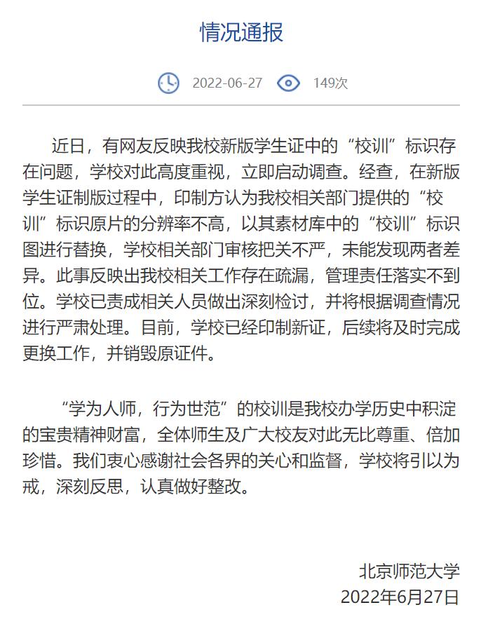 27日,北京师范大学发布《情况通报》称: