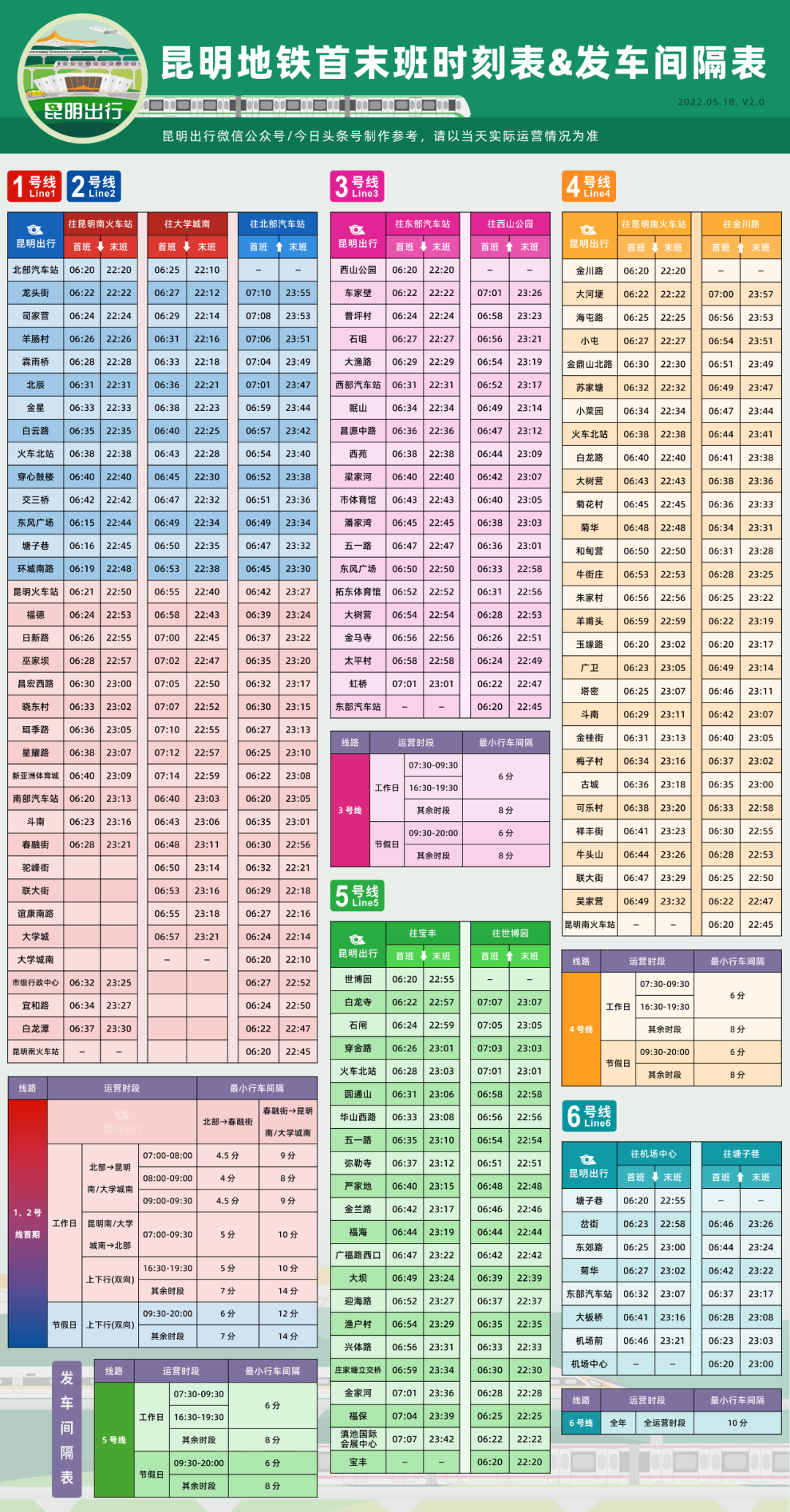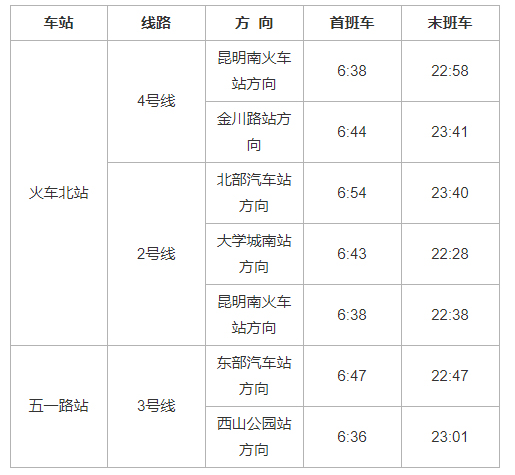 昆明市轨道交通5号线开通初期运营公告为加速昆明市轨道交通成网,为广大乘客提供更加优质、快捷、方便的出行服务,昆明市轨道交通5号线定于2022年6月29日11:00开通初期运营。现将有关事项公告如下:一、站点设置本次开通初期运营线路为: 世博园站、白龙寺站、石闸站、穿金路站、火车北站、圆通山站、华山西路站、五一路站、弥勒寺站、严家地站、金兰路站、福海站、广福路西口站、大坝站、迎海路站、渔户村站、兴体路站、庄家塘立交桥站、金家河站、福保站、滇池国际会展中心站、宝丰站, 全线共设置车站22座。5号线开通初期运营后与2、4号线在火车北站实现换乘,与3号线在五一路站实现换乘。二、运营时间世博园站至宝丰站方向为:6:20~22:55宝丰站往世博园站方向为:6:20~22:20三、各站首末班车时间