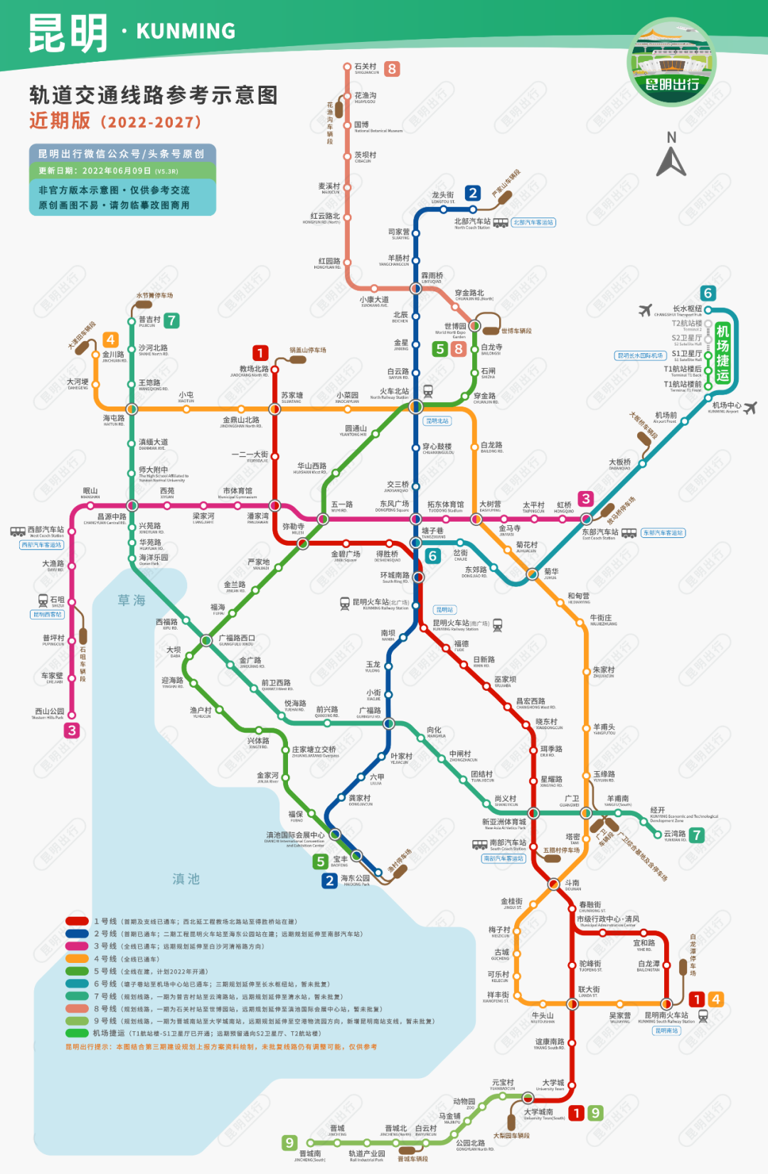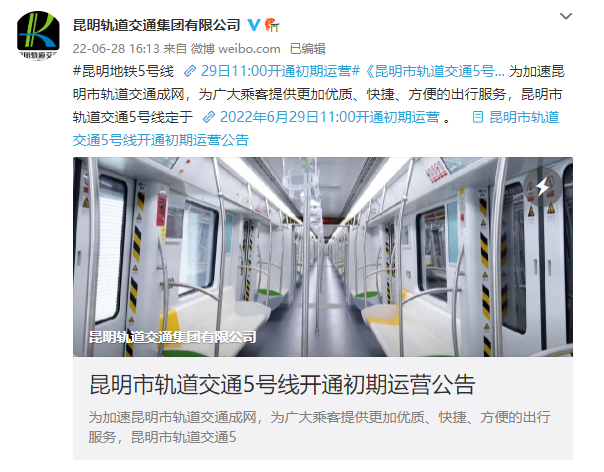 6月28日,昆明市交通运输局、昆明轨道交通集团有限公司、昆明轨道交通五号线建设运营有限公司发布公告:为加速昆明市轨道交通成网,为广大乘客提供更加优质、快捷、方便的出行服务,昆明市轨道交通5号线定于2022年6月29日11:00开通初期运营。