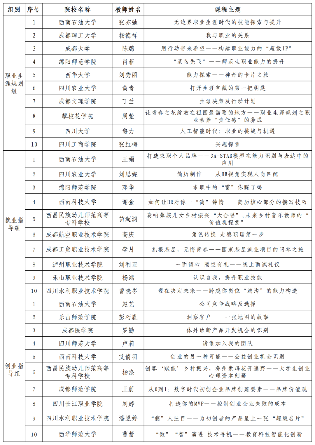 近期,四川省2022年高校就业创业指导金课评选活动在蓉圆满收官,30堂优秀课程被评为省级就业创业指导金课。