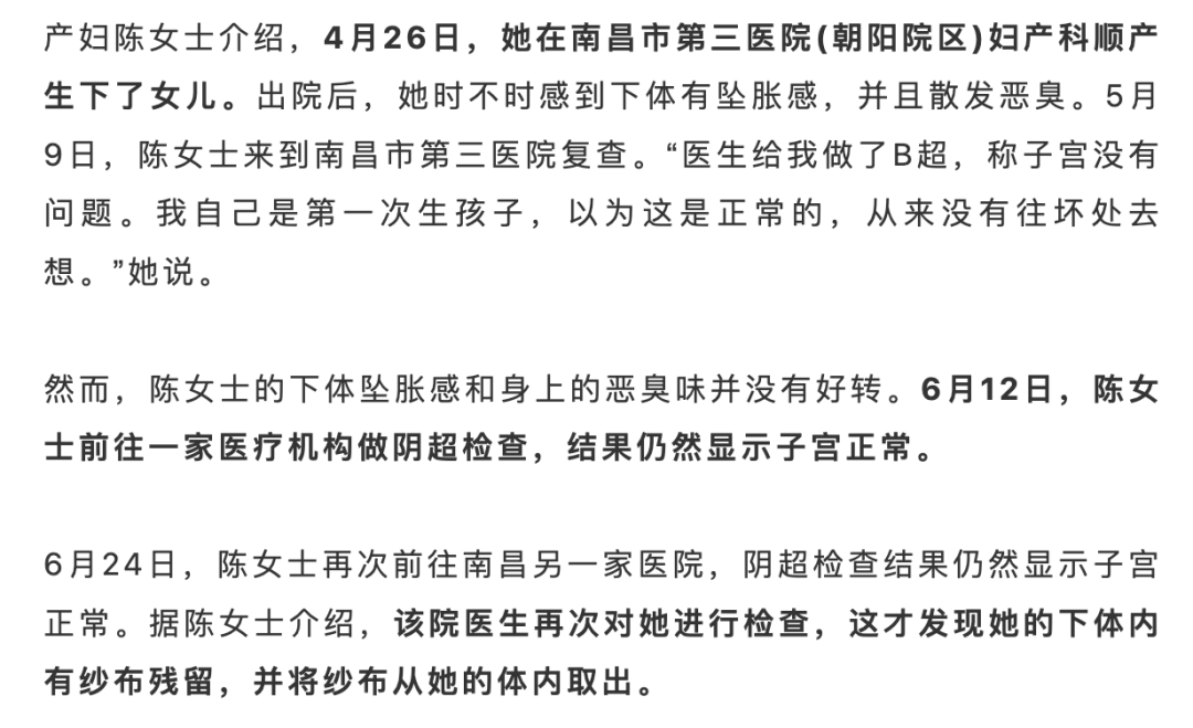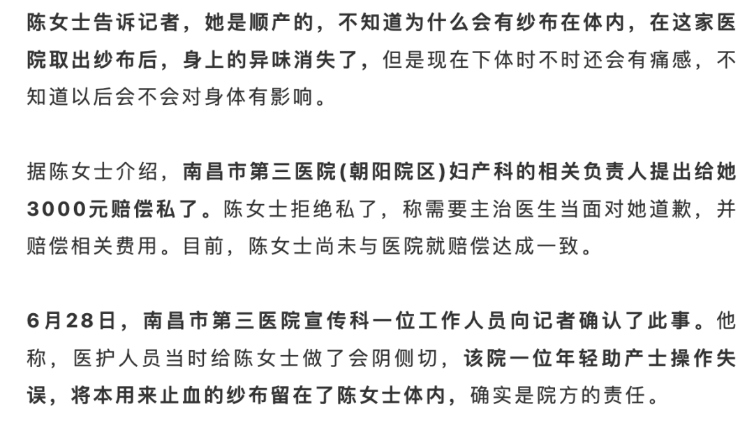产妇顺产生完女儿后,下体时不时有坠胀感并伴有异味,两个月后前往另一家医院检查后才发现体内竟有纱布残留,这样的事情发生在江西南昌的陈女士身上。6月28日,涉事的南昌市第三医院工作人员告诉记者,此事系该院年轻助产士操作失误,正与陈女士沟通赔偿事宜。