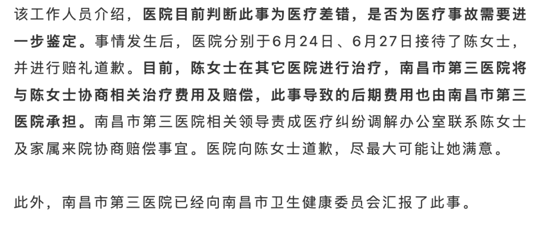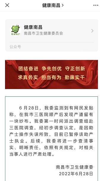 6月28日,南昌市卫健委对此发布回应称,该委派出调查组赴三医院调查,经初步调查认定,是因助产士操作失误所致,目前已暂停该助产士执业。