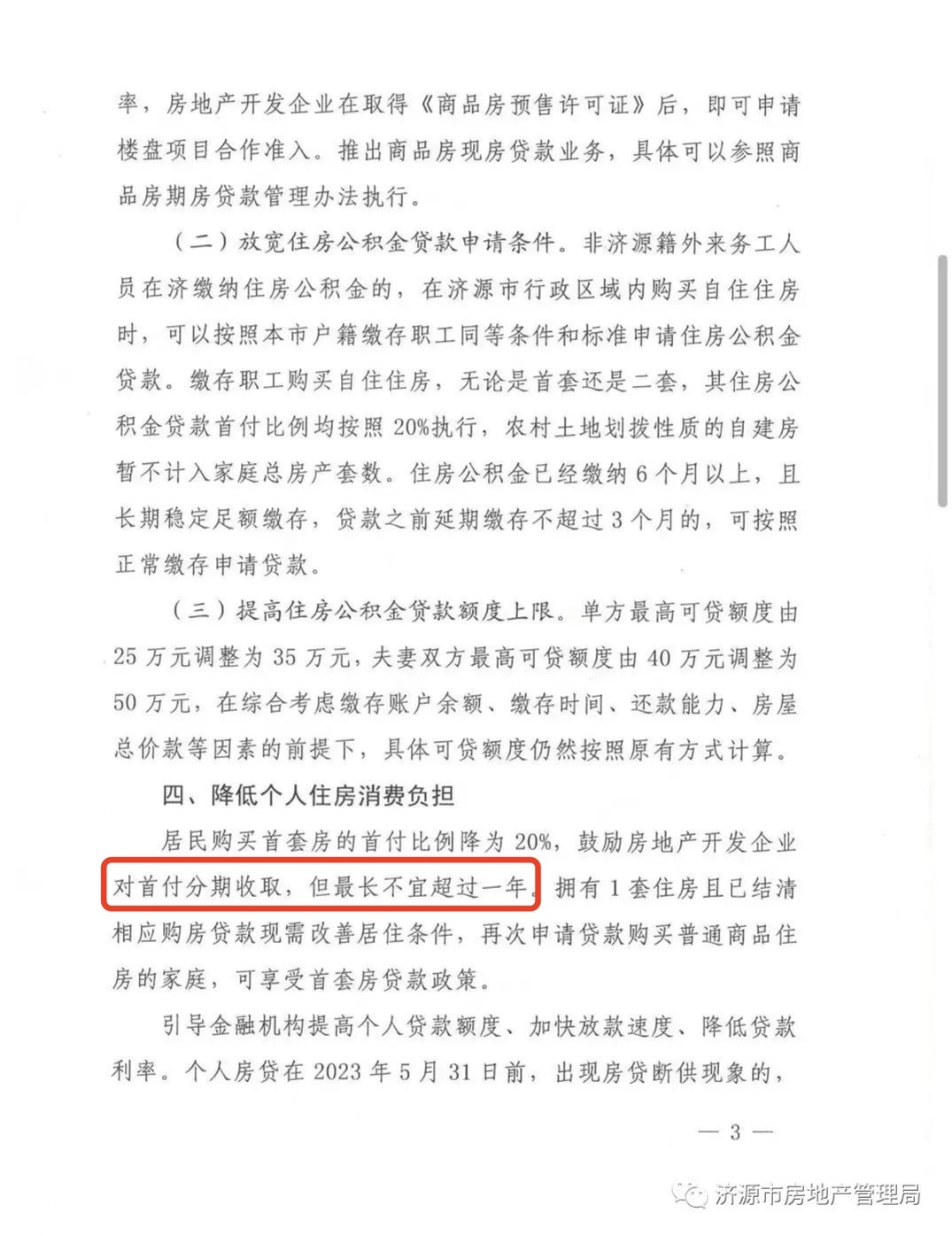 6月29日,据河南省济源市房地产管理局消息,《济源市促进房地产平稳健康发展若干措施》(以下简称《措施》)正式发布,居民购买首套房的首付比例降为20%,鼓励房地产开发企业对首付分期收取,但最长不宜超过一年。