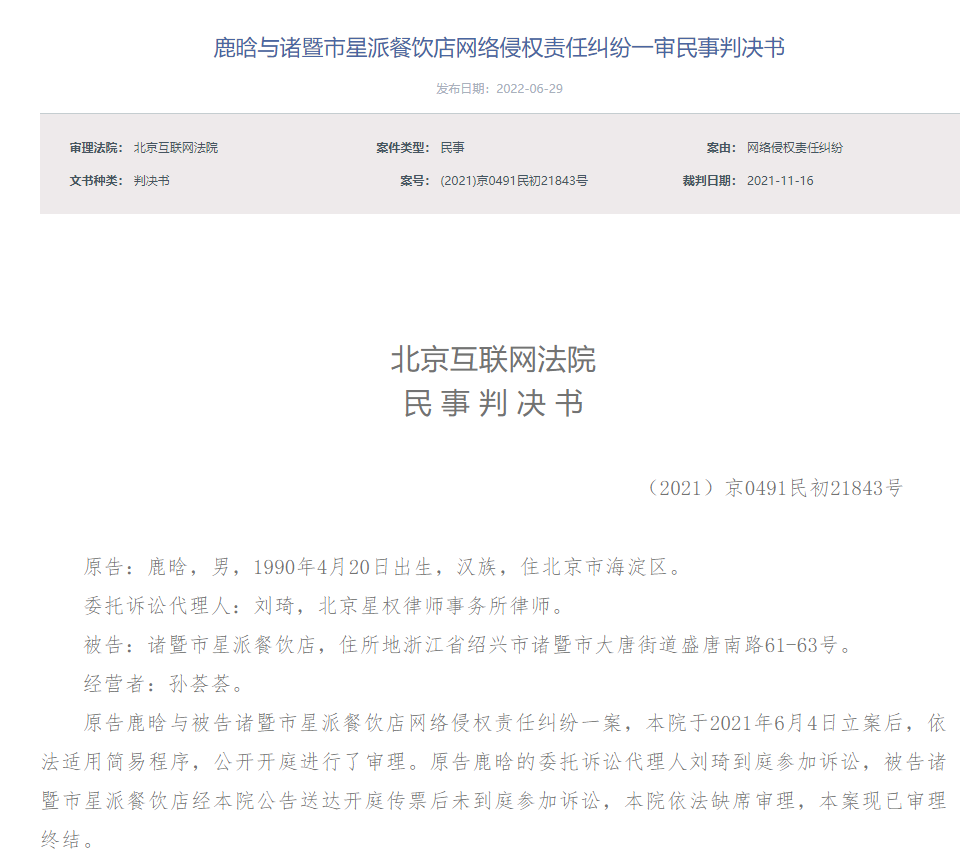 6月29日,北京法院审判信息网发布了鹿晗与诸暨市星派餐饮店相关网络侵权责任纠纷一审判决书。