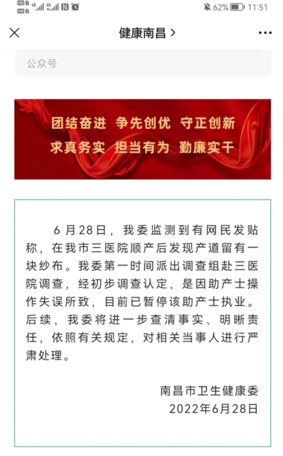 据南昌市卫生健康委官方微信公众号“健康南昌”6月28日晚10时许针对“女子产后体内遗留纱布”事件发布通报称,南昌市卫健委第一时间派出调查组赴南昌市第三医院调查。经初步调查认定,是助产士操作失误所致,目前已暂停该助产士执业。后续南昌市卫健委将进一步查清事实、明晰责任,依照有关规定,对相关当事人进行严肃处理。
