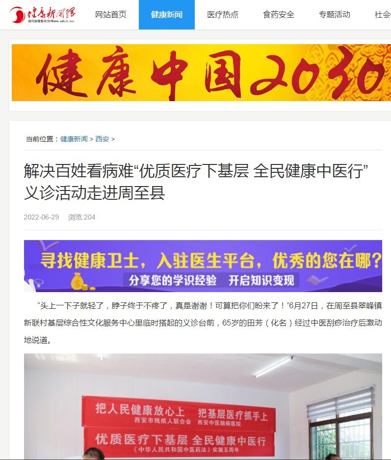 “头上一下子就轻了,脖子终于不疼了,真是谢谢!可算把你们盼来了!”6月27日,在周至县翠峰镇新联村基层综合性文化服务中心里临时搭起的义诊台前,65岁的田芳(化名)经过中医刮痧治疗后激动地说道。