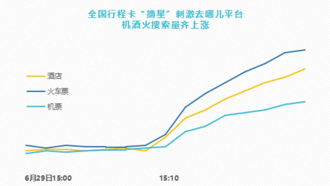 6月29日,工信部网站发布消息,即日起取消通信行程卡“星号”标记。消息发布后,携程、去哪儿等平台上火车票、热门目的地的搜索量增长,用户旅游出行意愿进一步高涨。