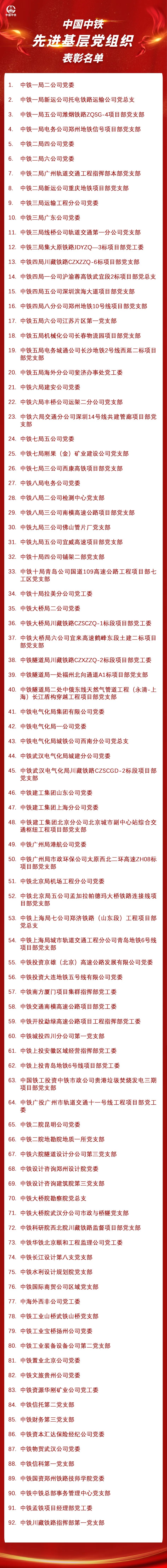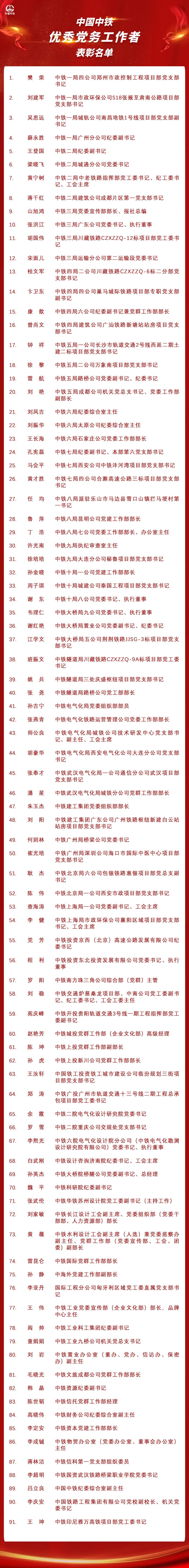 在喜迎党的二十大、庆祝中国共产党成立101周年之际,为进一步树立典型,弘扬正气,动员和激励全公司各级党组织和广大共产党员、党务工作者坚定理想信念、立足岗位建功,在深化改革、推动发展,发挥中国中铁稳住经济大盘的“顶梁柱”“压舱石”作用中当先锋、作表率,股份公司党委决定,授予孙永震等138名同志“中国中铁优秀共产党员”称号,授予樊荣等91名同志“中国中铁优秀党务工作者”称号,授予中铁一局二公司党委等92个党组织“中国中铁先进基层党组织”称号。