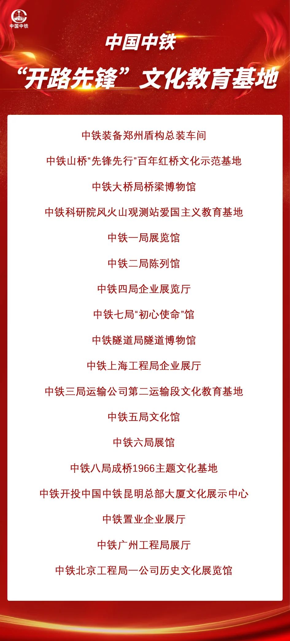 同时,为大力弘扬中国中铁“开路先锋”文化,进一步创新思想政治工作,凝聚强大精神力量,展示企业良好形象,根据《中国中铁“开路先锋”企业文化建设实施纲要》《中国中铁企业文化建设“十四五”规划》,股份公司党委决定,命名中铁装备郑州盾构总装车间等18家单位为首批中国中铁“开路先锋”文化教育基地。